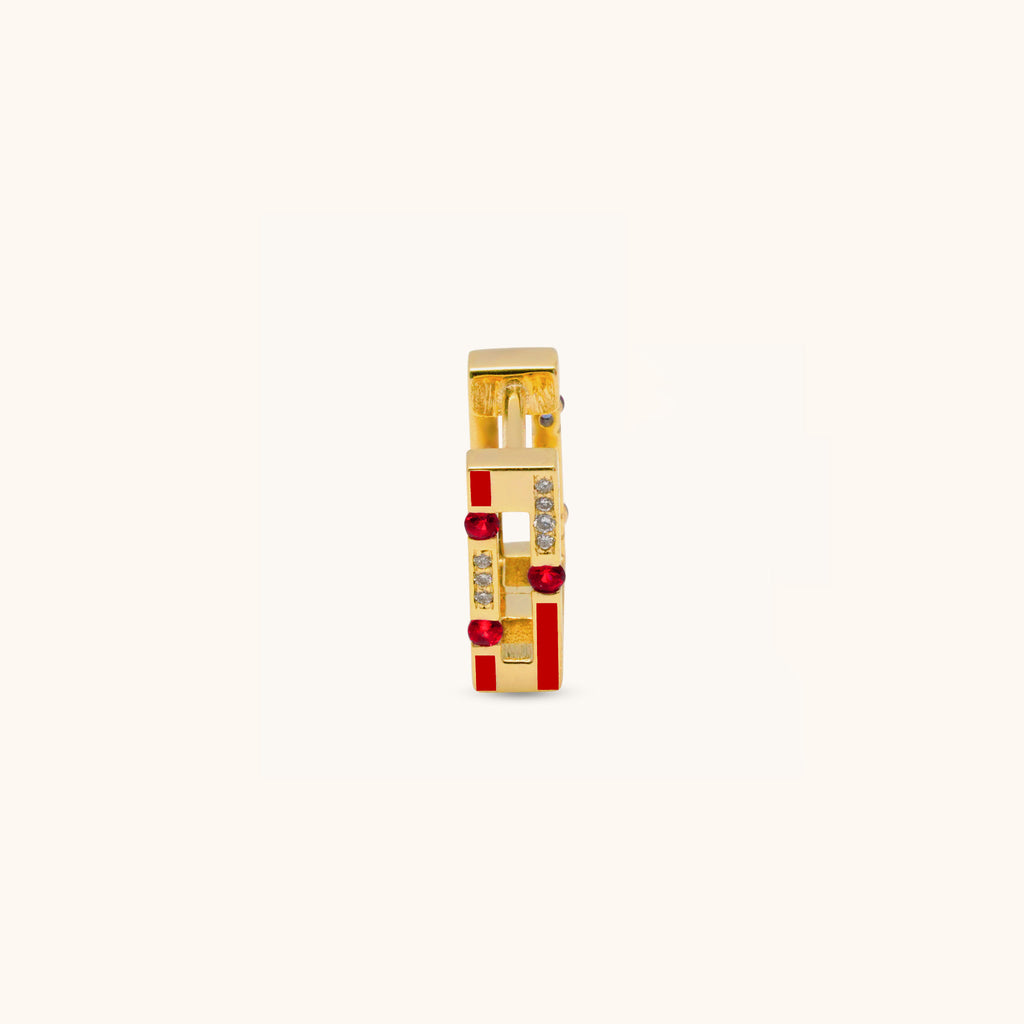 This Versa Diamond and Rubies Single Hoop is crafted in 18K gold and designed with two looks in one. One side features natural diamonds with ruby stones set in red enamel, while the other pairs diamonds with white enamel for a more classic style. Made for versatility, you can flip tit to show either side and match your mood. Whether worn solo or stacked with other pieces, this hoop gives you flexible styling options for any occasion.